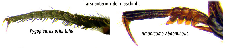 Primi 4 articoli dei tarsi anteriori nei maschi appiattiti e trasversi come denti di un pettine, quinto articoli più lungo che i 4 precedenti.