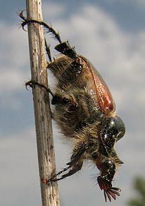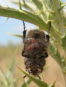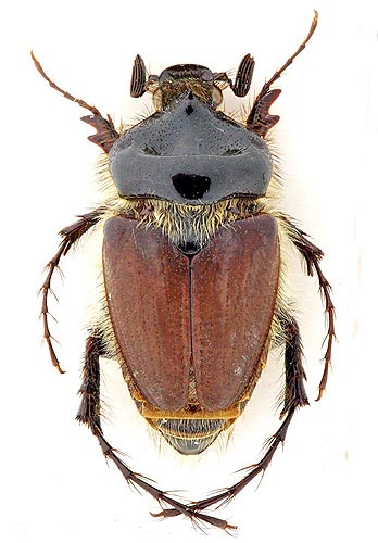 Lunghezza 11-13 mm; colore: pronoto e scutello bruno scuri, lucidi; elitre brune, opache, appena più scure agli omeri e verso l'apice; appendici e superficie ventrale bruno-giallastre. Pubescenza folta e dorata, sui lati del corpo e inferiormente. Capo con labbro superiore allungato, di forma triangolare; clipeo di forma semicircolare, 2 volte più largo che lungo, incavato anteriormente, con punti grossi e irregolari; sutura clipeo-frontale poco rilevata, sita più vicina al margine posteriore degli occhi che al bordo anteriore del clipeo; fronte rugosa. Antenne di 8 articoli, il primo allungato e più dilatato in avanti, il secondo corto, il terzo tronco-conico, 1,5 volte più lungo che largo all'apice; clava antennale (ultimi 5 articoli) ben sviluppata, allungata, poco più lunga dei primi 4 articoli assieme, con l'ultimo articolo subeguale al quarto. Ultimo articolo dei palpi mascellari troncato all'apice.