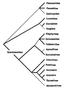 Mentre il dibattito tra ricercatori è aperto, sono in corso analisi filogenetiche delle categorie superiori degli Scarabeidi e i loro risultati permettono già di comprendere meglio i rapporti fra i gruppi. Nel 1999 è stata condotta un'analisi filogenetica di 13 famiglie di Scarabaeoidea e della maggior parte delle sottofamiglie utilizzando 134 caratteri morfologici degli adulti (Brown e Scholtz 1999). Dai risultati di questa analisi emerge che la superfamiglia Scarabaeoidea sarebbe composta da tre grandi lienee filetiche: la "linea glaresidi" costituita solo dalla famiglia Glaresidae; la "linea passalidi" costituita da due linee principali: una "sottolinea glafiridi" (contenente Glaphyridae, Passalidae, Lucanidae, Diphyllostomatidae, Trogidae, Bolboceratidae e Pleocomidae) e una "sottolinea geotrupidi" (contenente Geotrupidae, Ochodaeidae, Ceratocanthidae e Hybosoridae); e la "linea scarabeidi" (contenente Aphodiinae, Scarabaeinae, Orphninae, Melolonthinae, Rutelinae, Dynastinae e Cetoniinae).